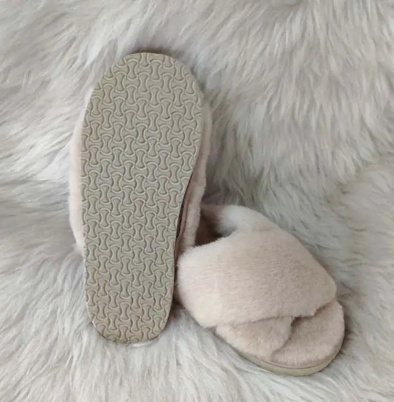 Дамски чехли с отворени пръсти, изцяло изработени от агнешка кожа и с ходило от евапрен, което не пропуска вода и не се пързаля. Използваните суровини и технологии в производствения процес гарантират приятен и напълно безвреден допир с кожата. Носенето на чехли от естествена агнешка кожа не позволява изпотяването на стъпалото и поддържа естествената човешка температура.