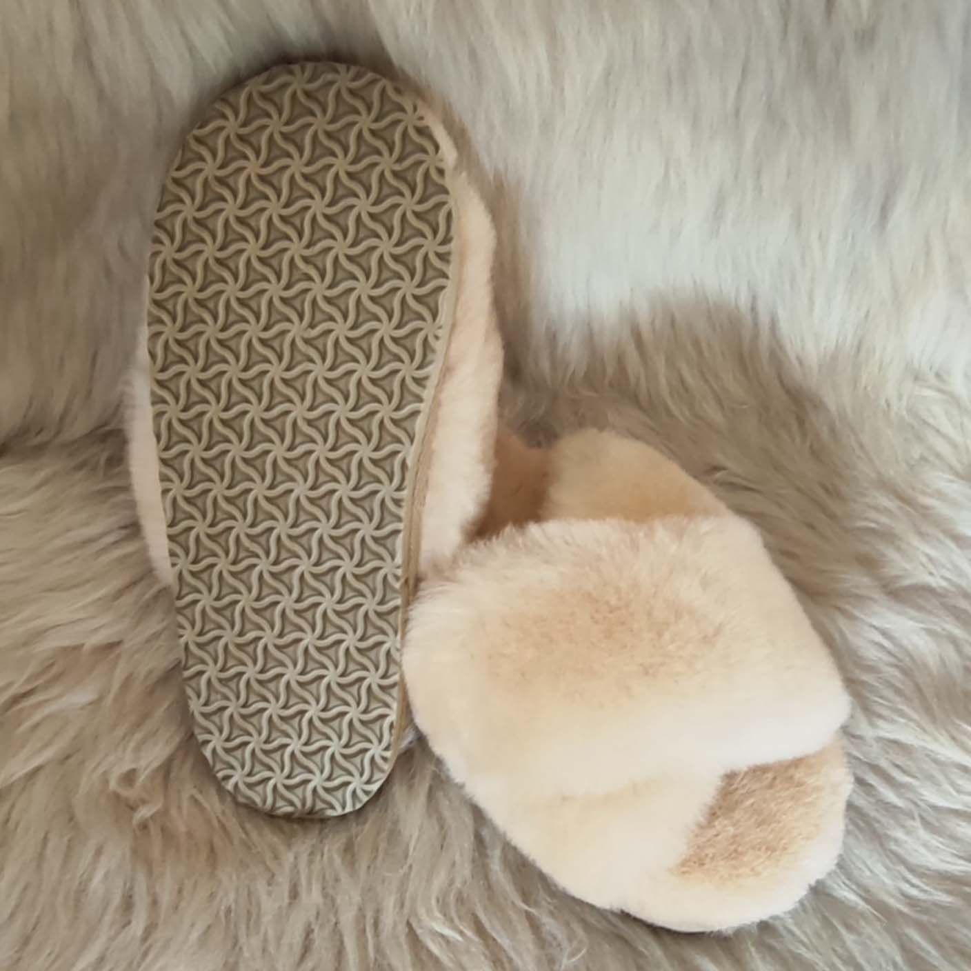 Дамски чехли с отворени пръсти, изцяло изработени от агнешка кожа и с ходило от евапрен, което не пропуска вода и не се пързаля. Използваните суровини и технологии в производствения процес гарантират приятен и напълно безвреден допир с кожата. Носенето на чехли от естествена агнешка кожа не позволява изпотяването на стъпалото и поддържа естествената човешка температура.