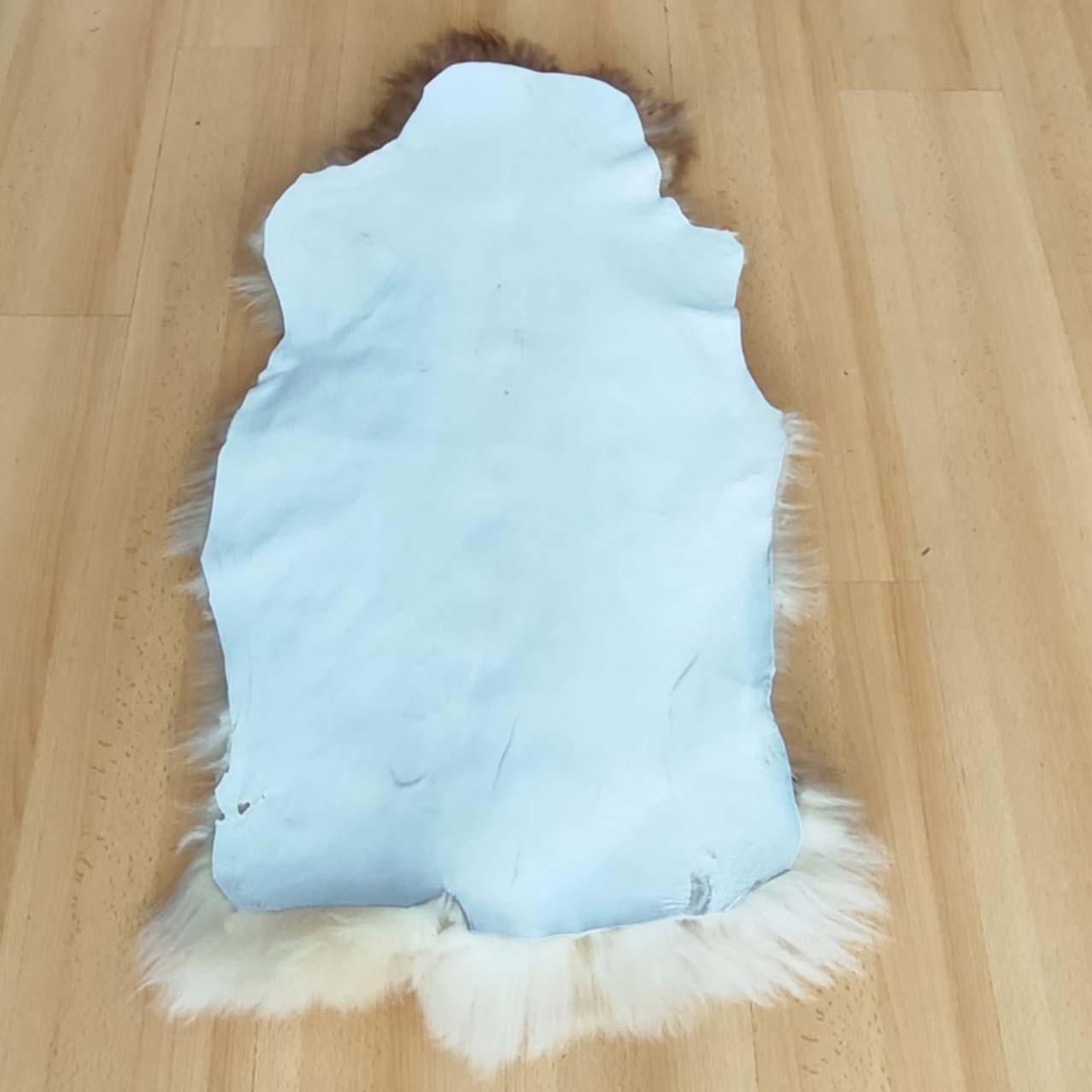 Натурална агнешка кожа, небоядисвана с естествени шарки. Обработена е с най-безвредните и качествени материали, напълно подходяща за килим за бебета и малки деца.